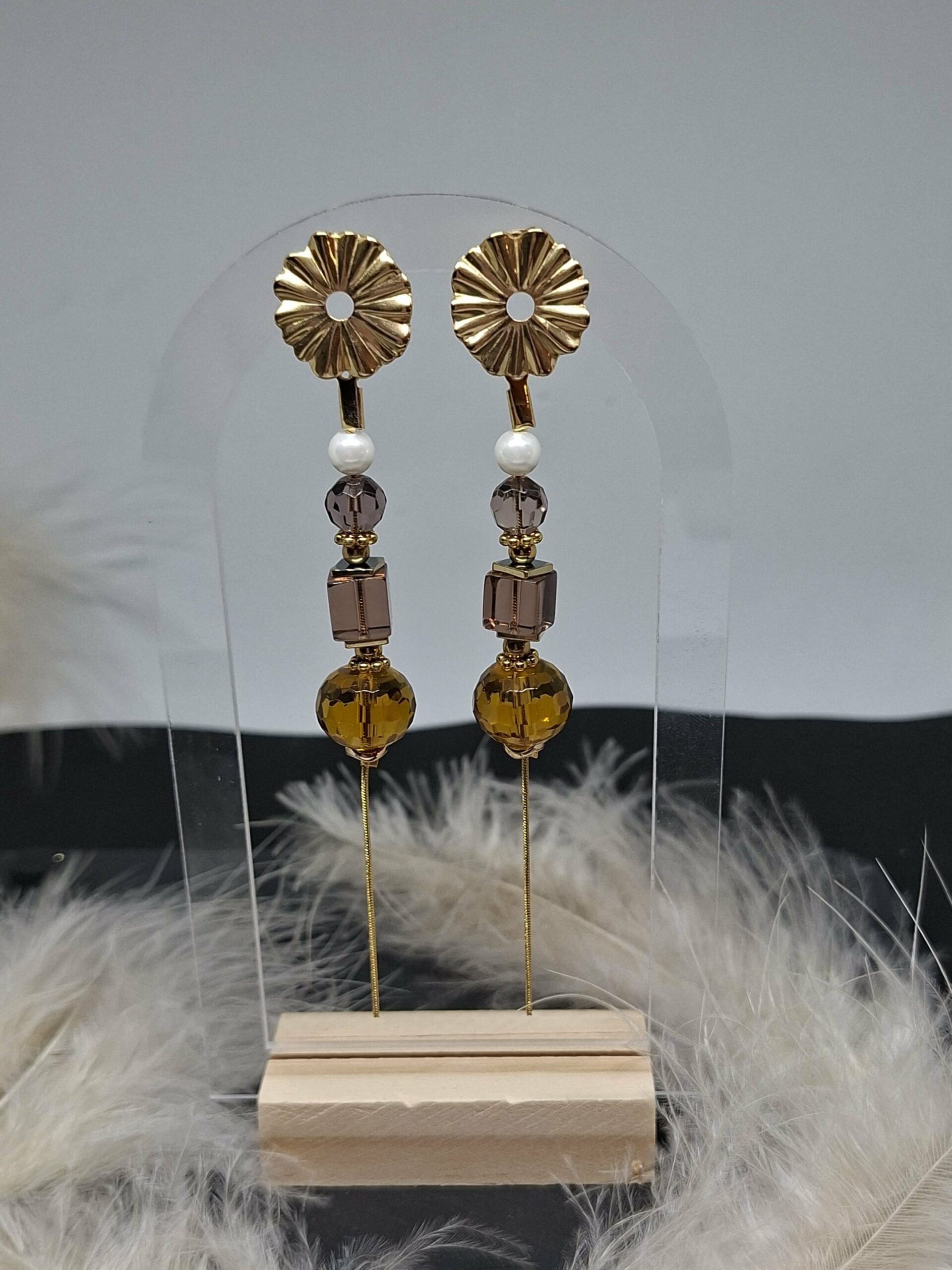 Boucles composées de cube en cristal, une petite et une grosse perle facettée en cristal et perle en verre blanc.