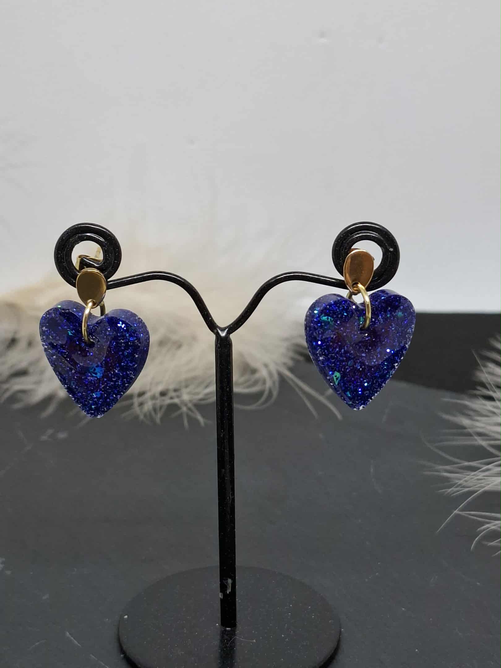 Boucles en forme de coeur pailleté bleu, en résine.