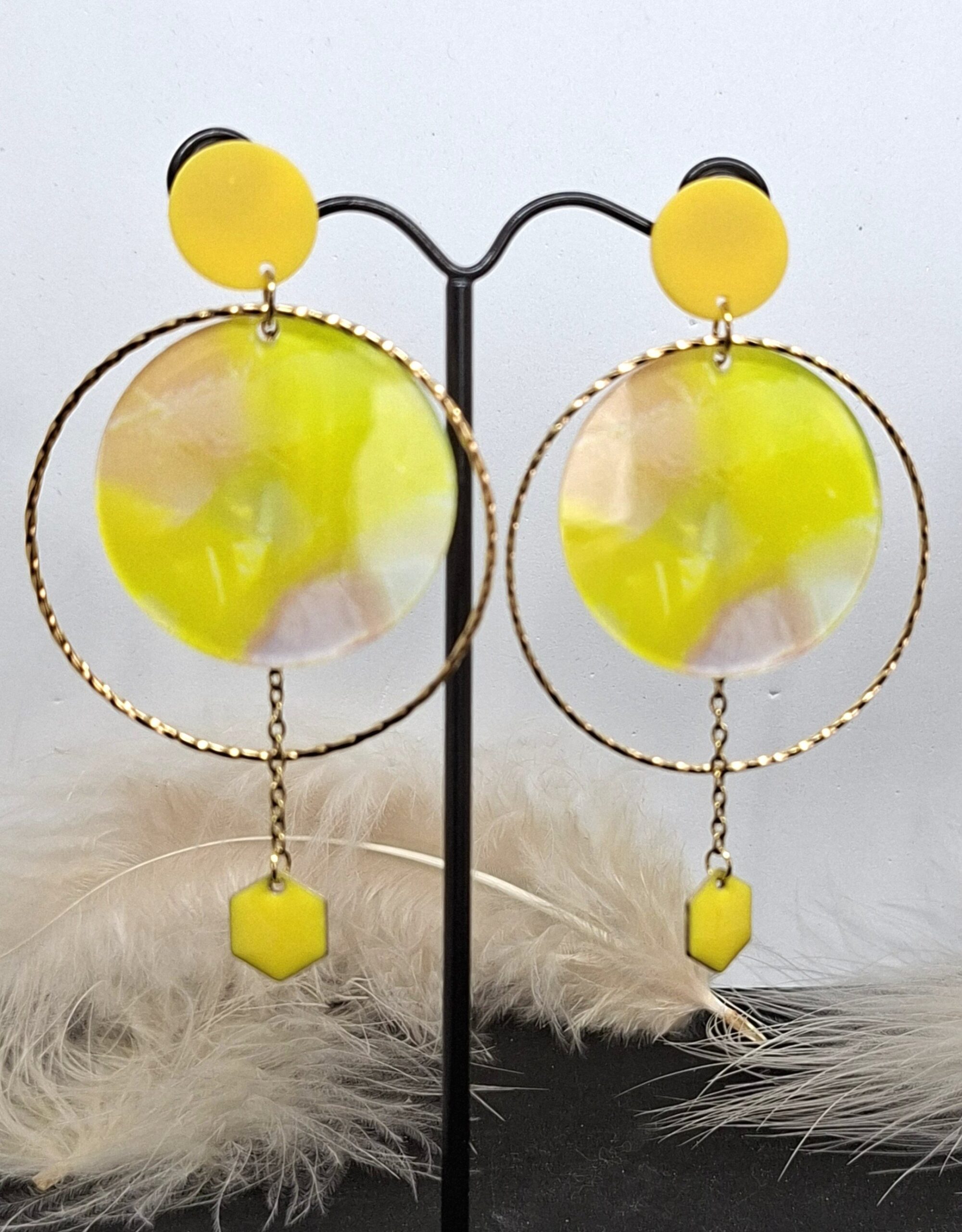 Boucles d’oreilles dans les tons jaunes.