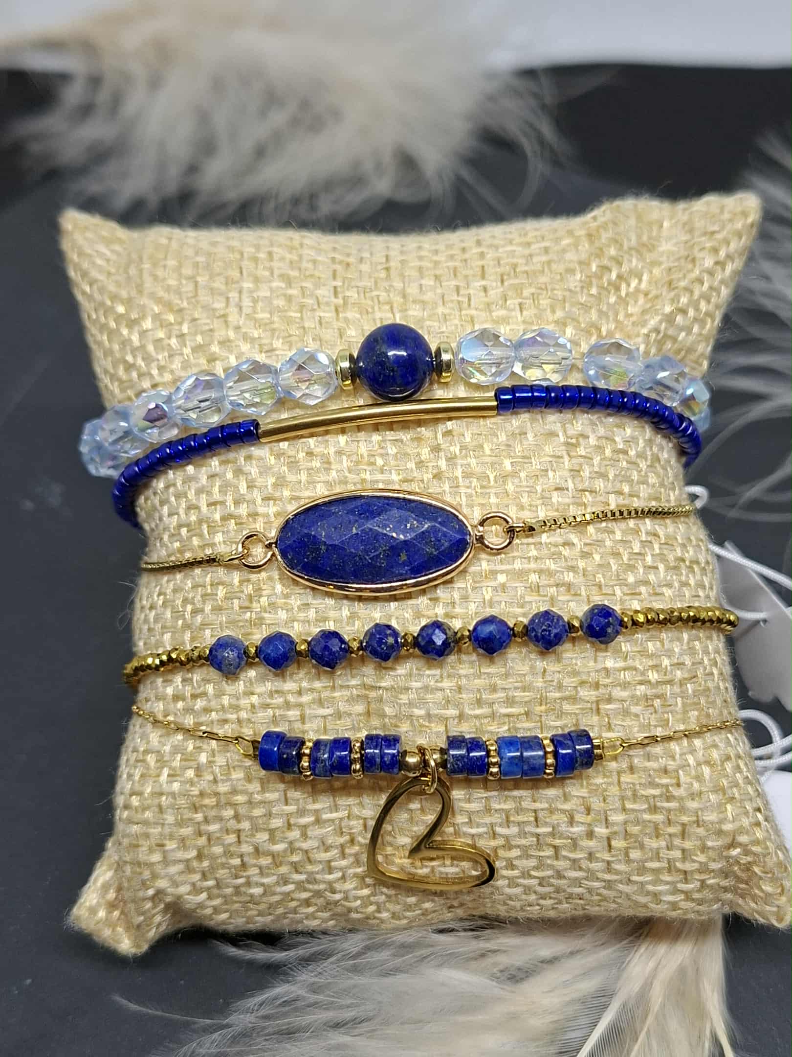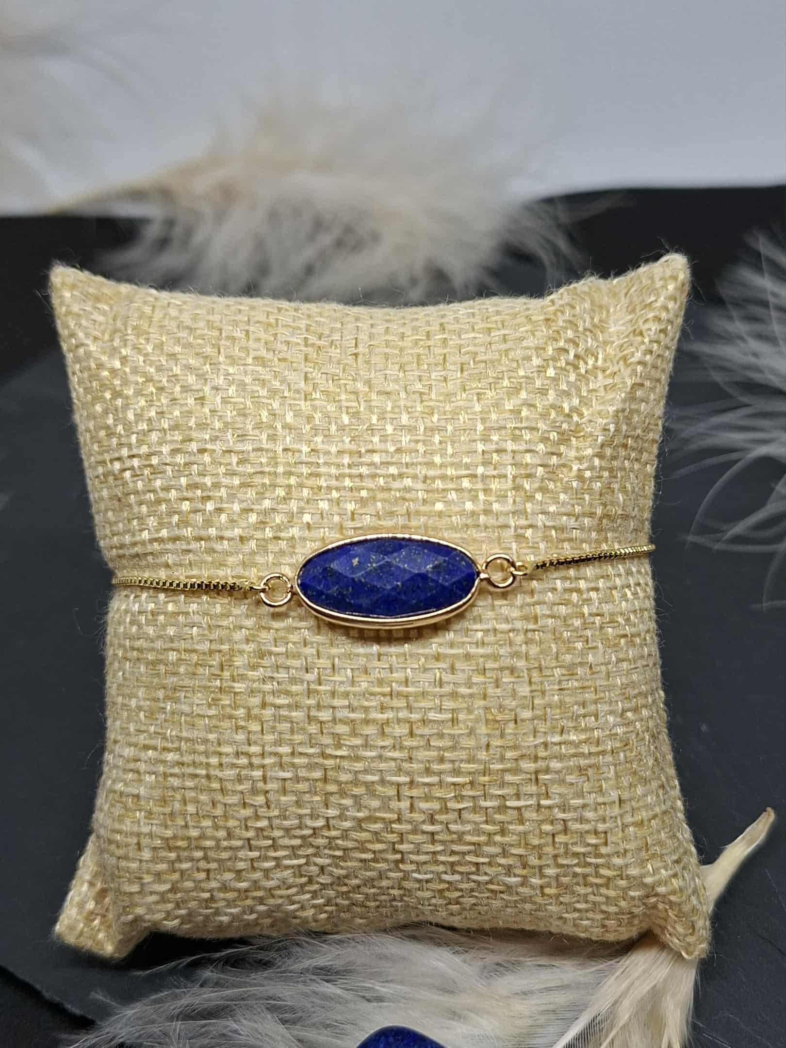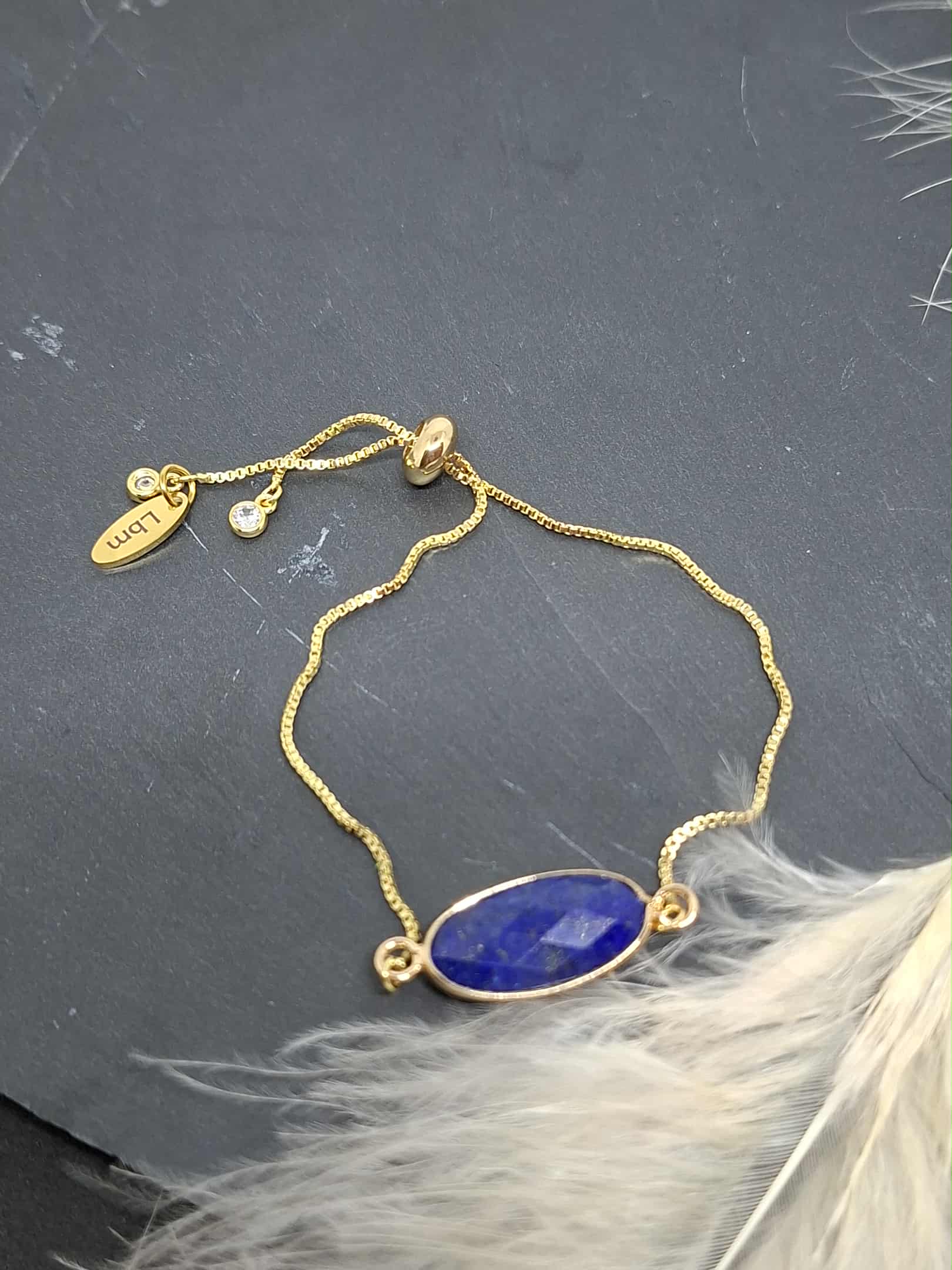 Bracelet avec connecteur en pierre semi-précieuse de lapis lazuli, système de fermeture par perle coulissante, zircon au bout de chaque chef de la chaîne. Le tout en acier inoxydable.