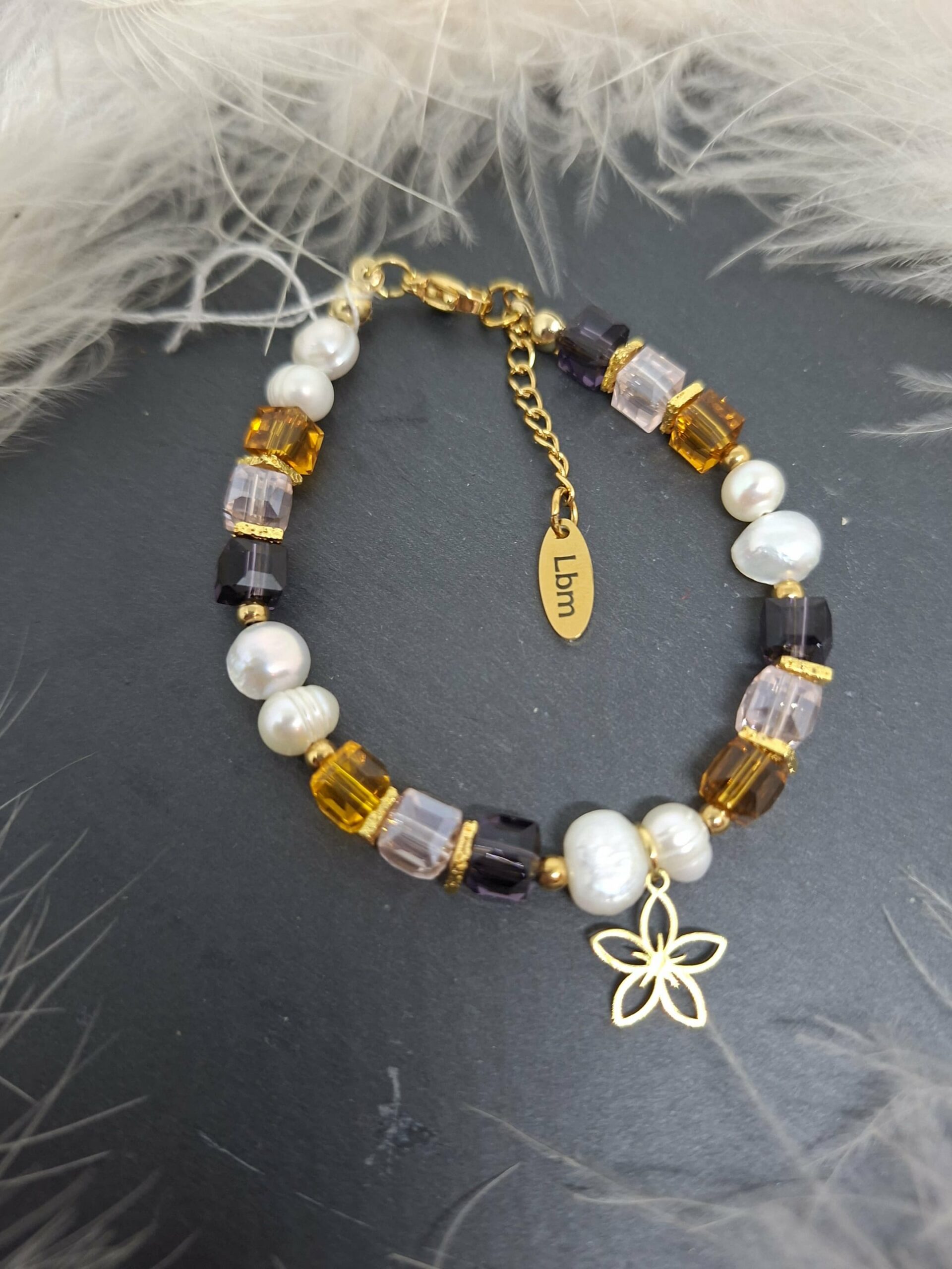 Bracelet composé de cubes en cristal tons « chauds », perles intercalaires en pierre de lave dorée, perles d’eau douce, breloque petite fleur en acier inoxydable.