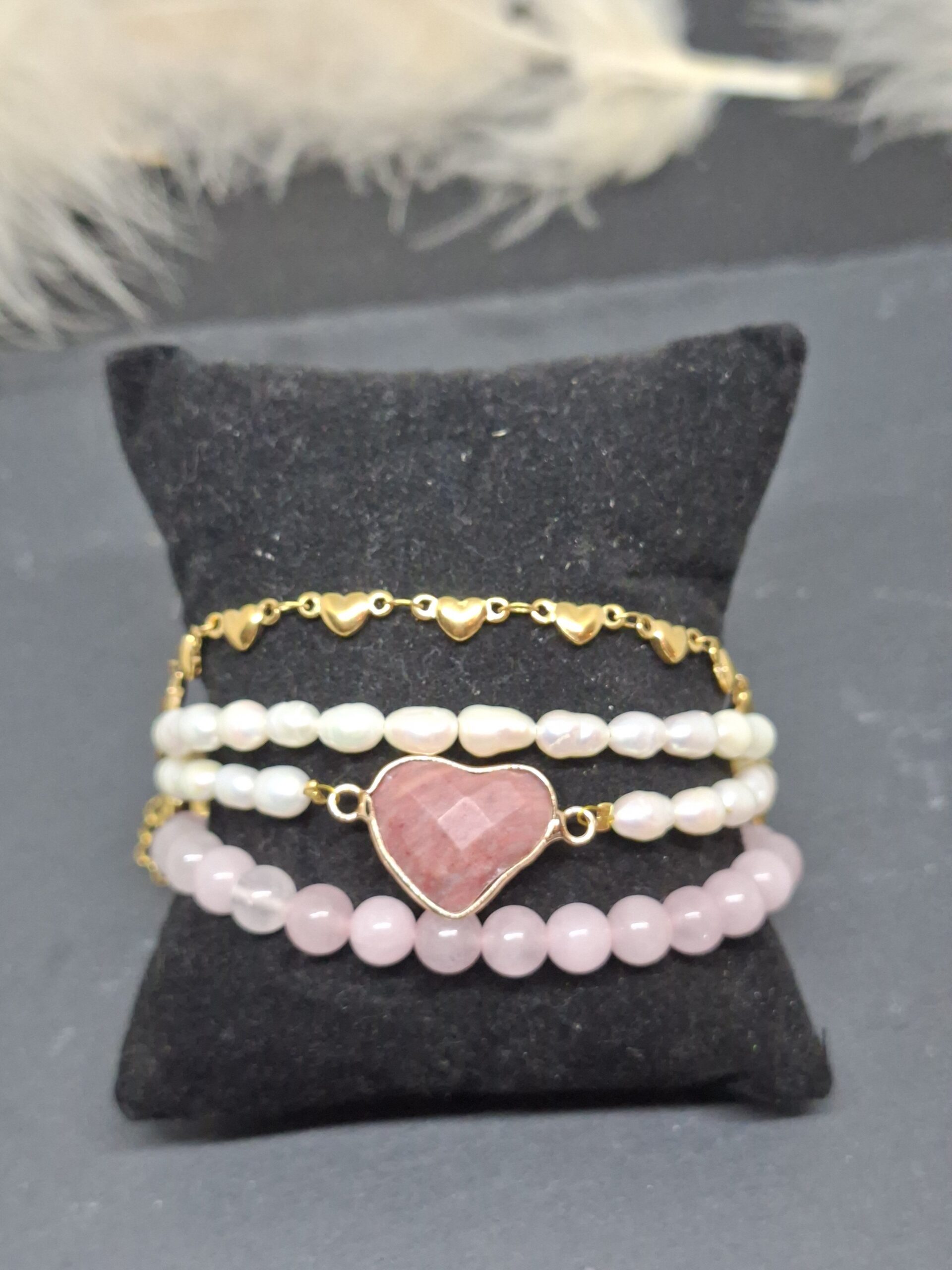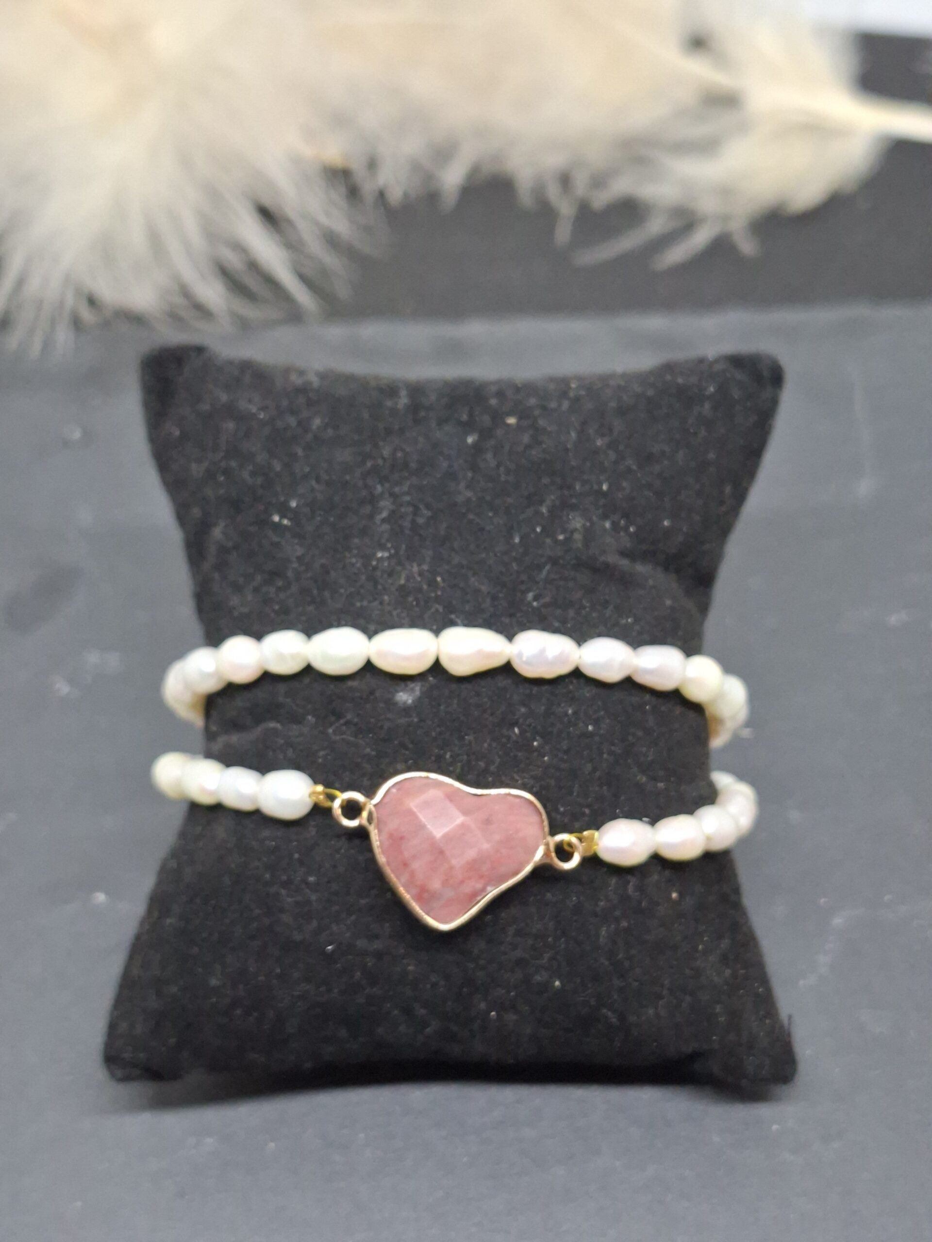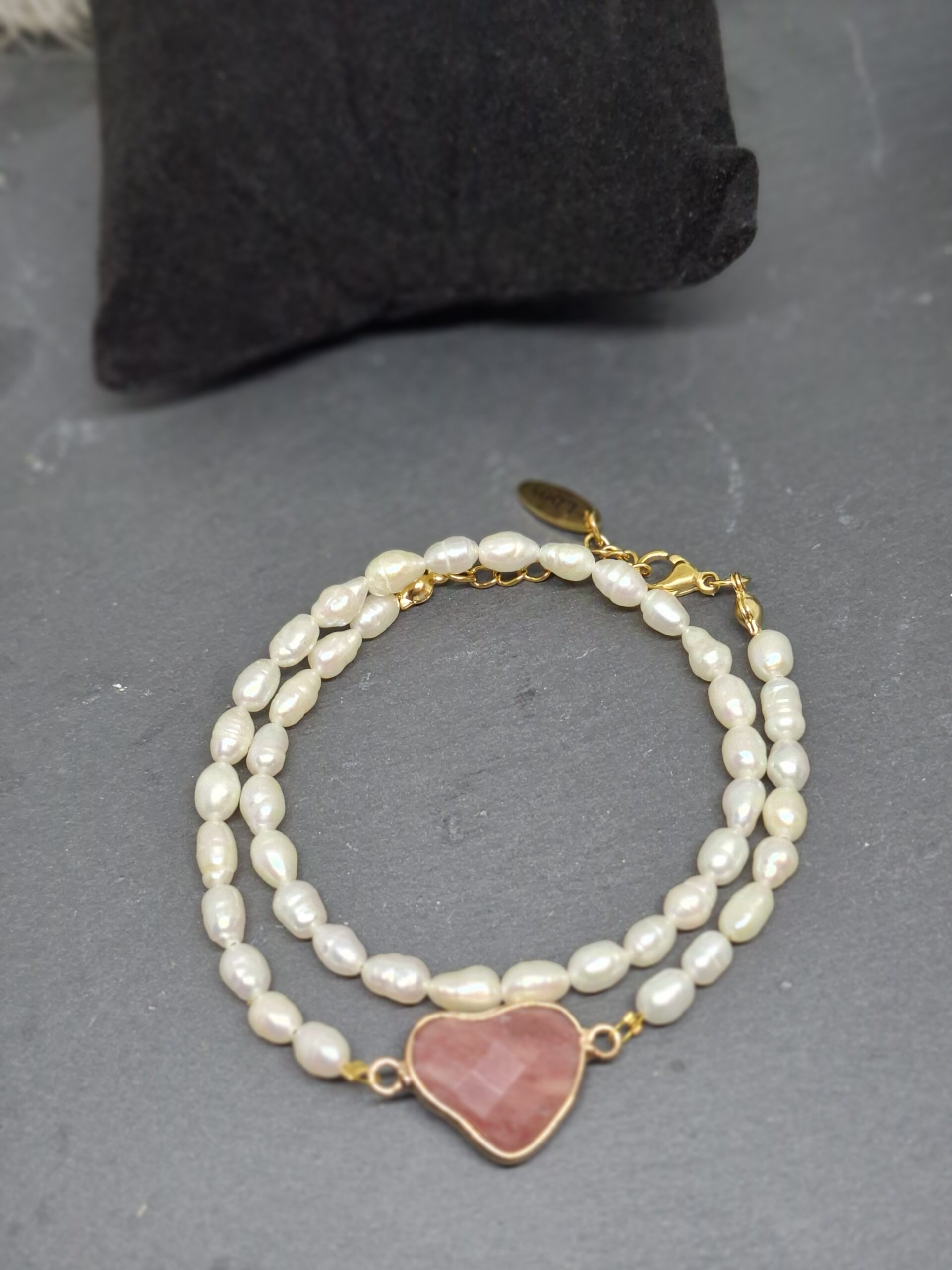 Bracelet Deux Dours Perles de Culture d’Eau Douce et Cœur en Rhodochrosite