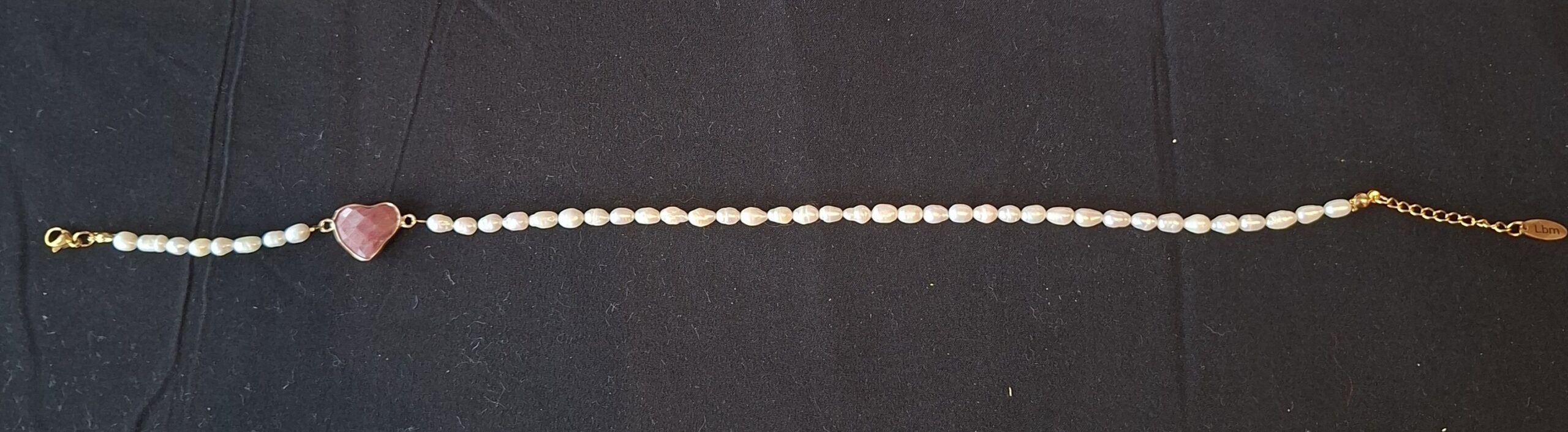 Il est composé de perles de culture d’eau douce aux formes légèrement irrégulières, offrant un éclat naturel et raffiné. En son centre, un cœur en rhodochrosite facettée apporte une touche douce et lumineuse, symbole d’amour et d’harmonie.