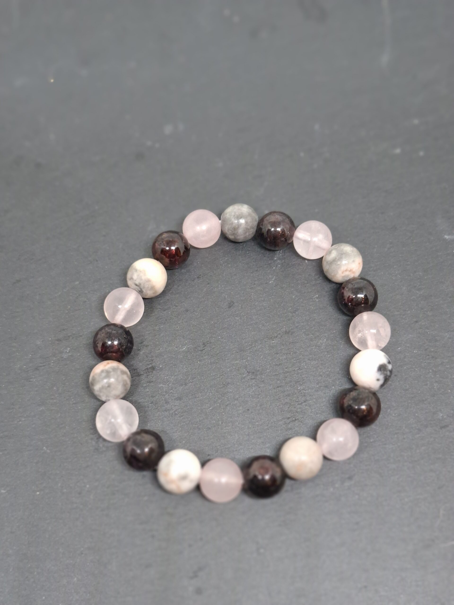 Bracelet délicat composé de perles 8mm en rhodonite, quartz rose et grenat aux teintes douces et naturelles.