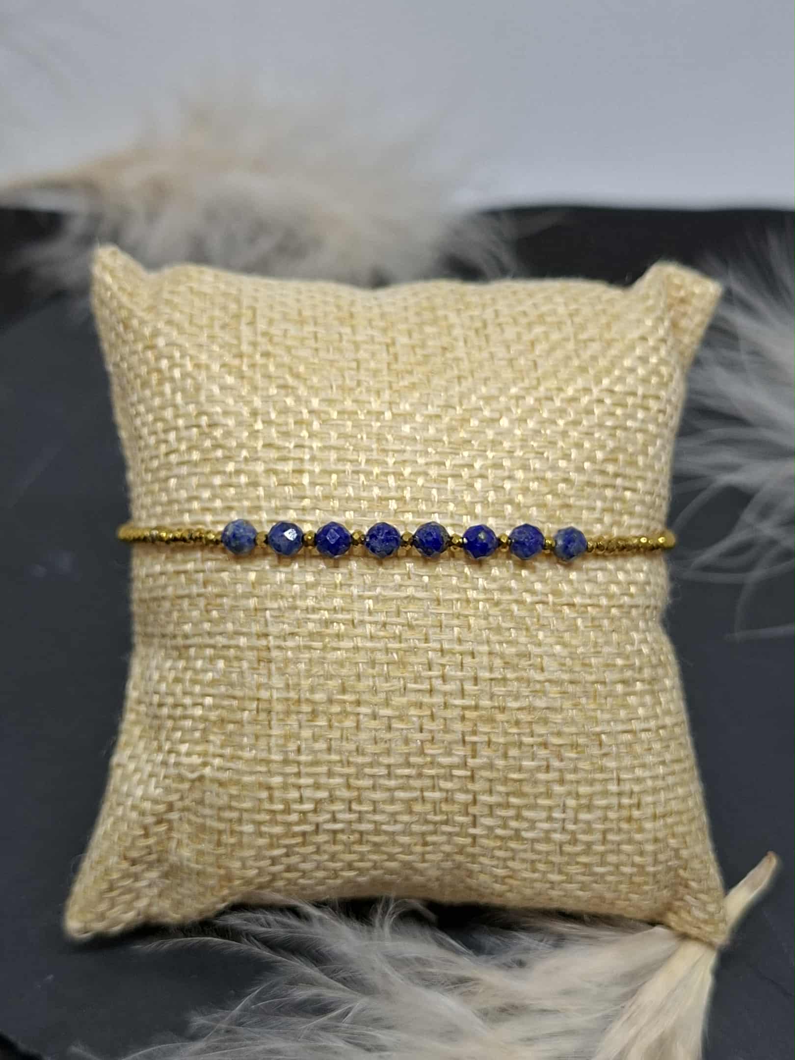 Bracelet en petites perles de cristal doré et perles facettées de lapis lazuli.