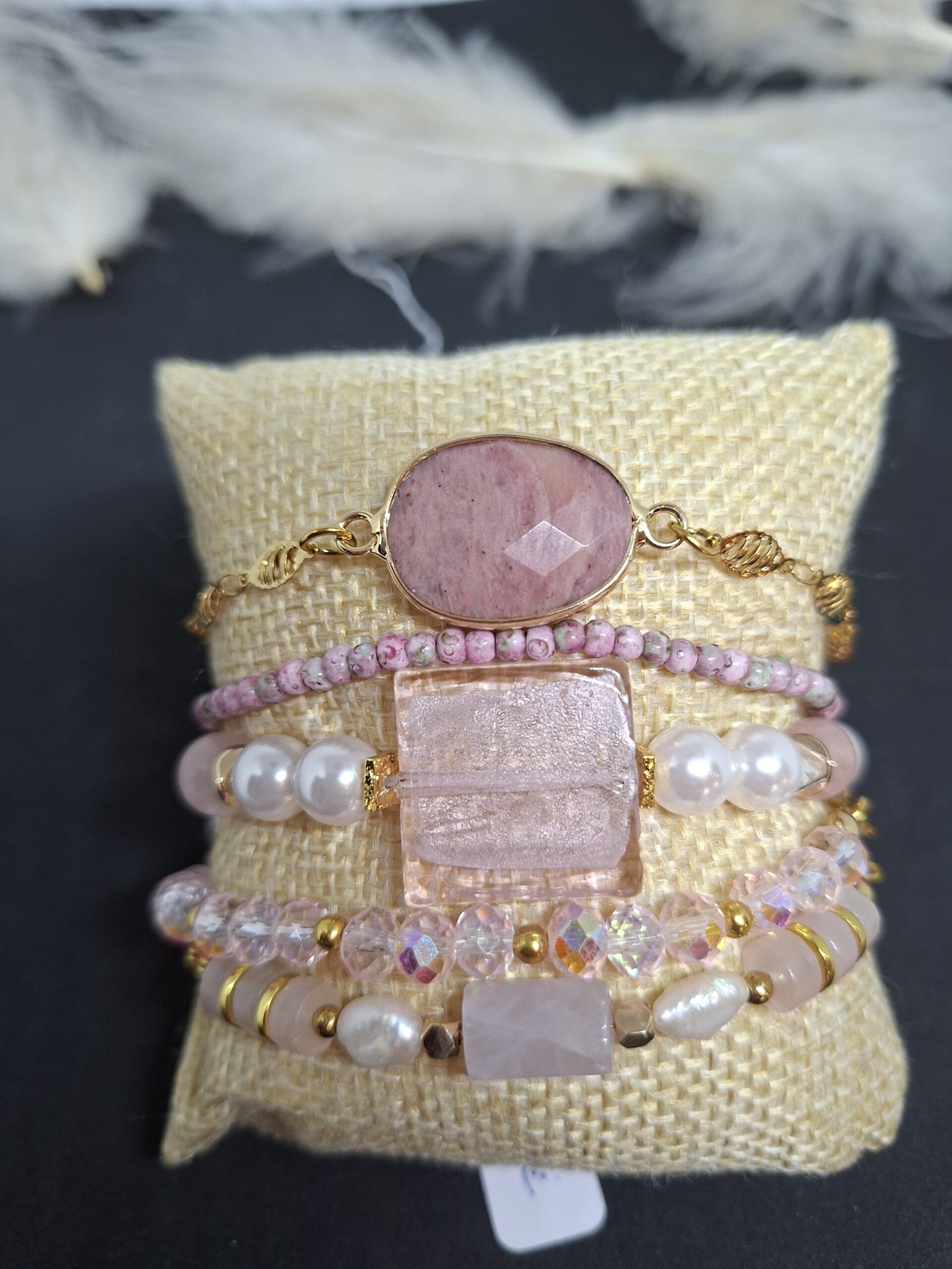 Bracelet composé de perles blanches en verre, perles de Quartz rose, une perle plate carrée en verre.