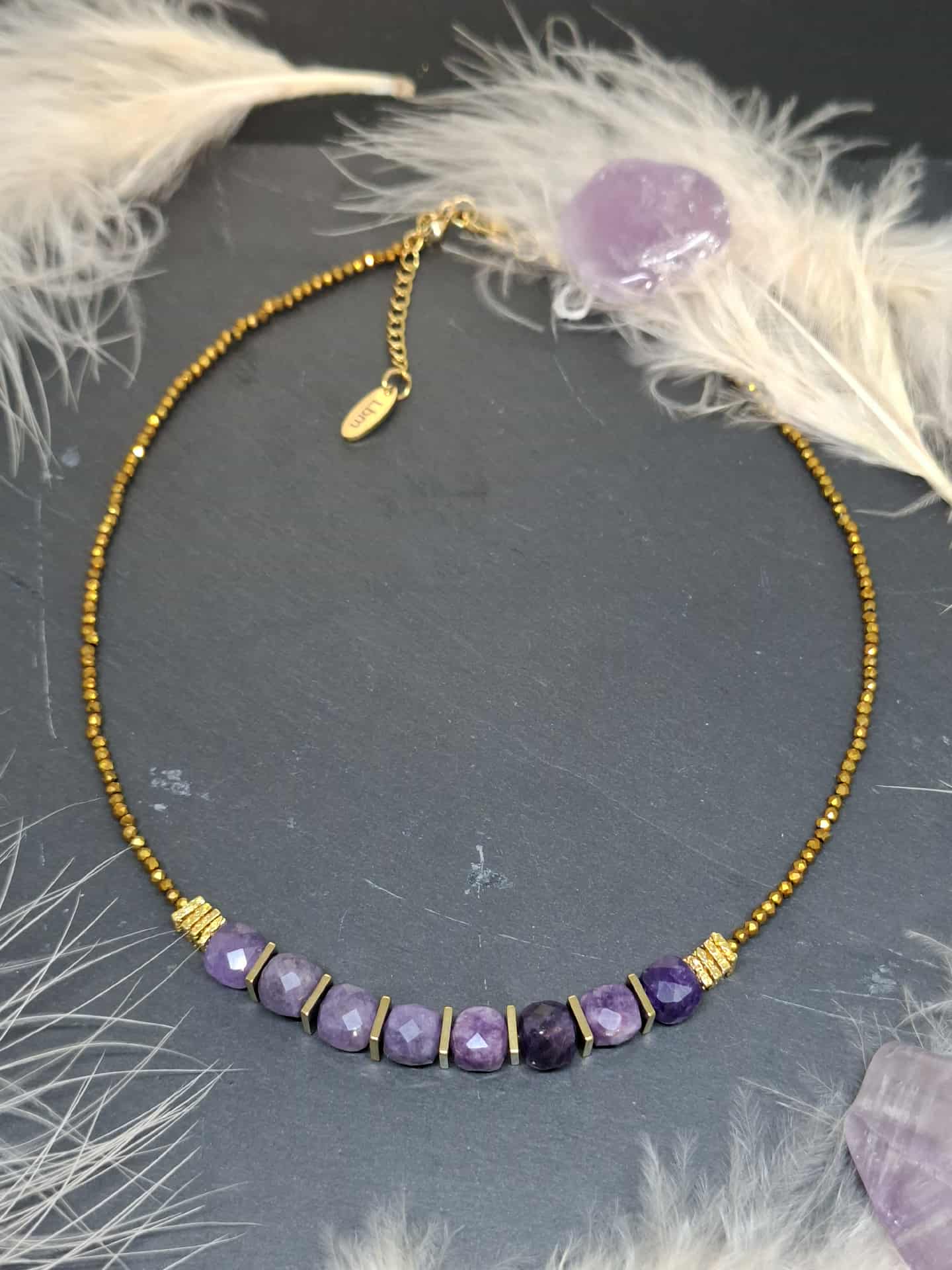 Collier en pierres cubes d’améthyste , petites perles facettées de cristal doré.