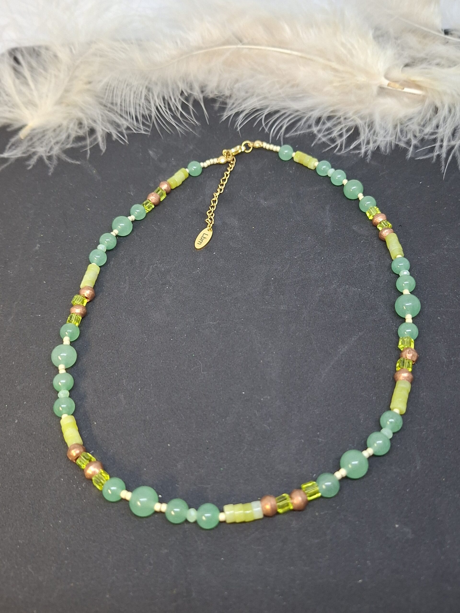 Collier alliant perles en aventurine 8mm, 6mm, rondelles de jade, cubes en cristal vert, rocaille et perles africaine en métal Cuivrée.
