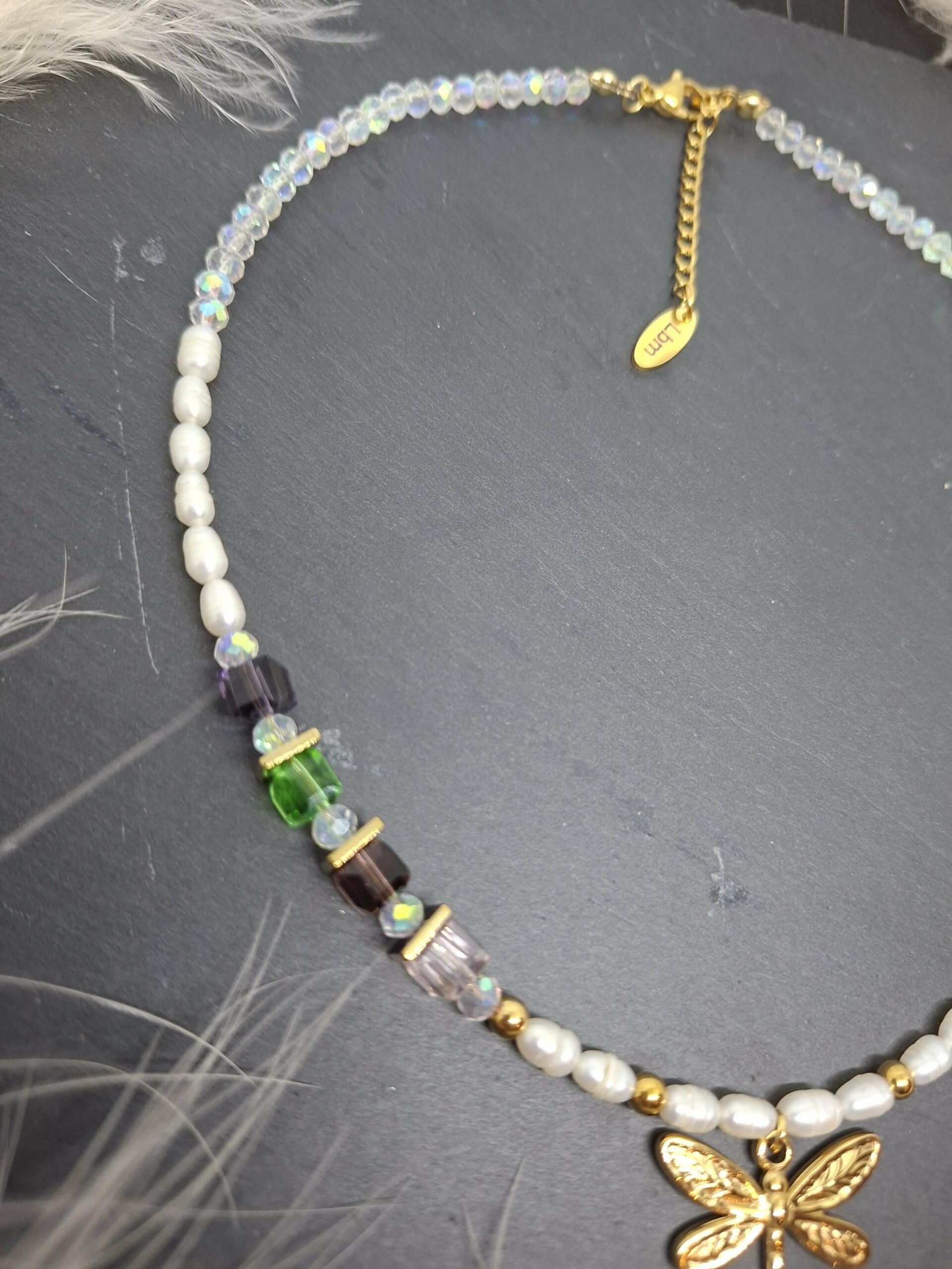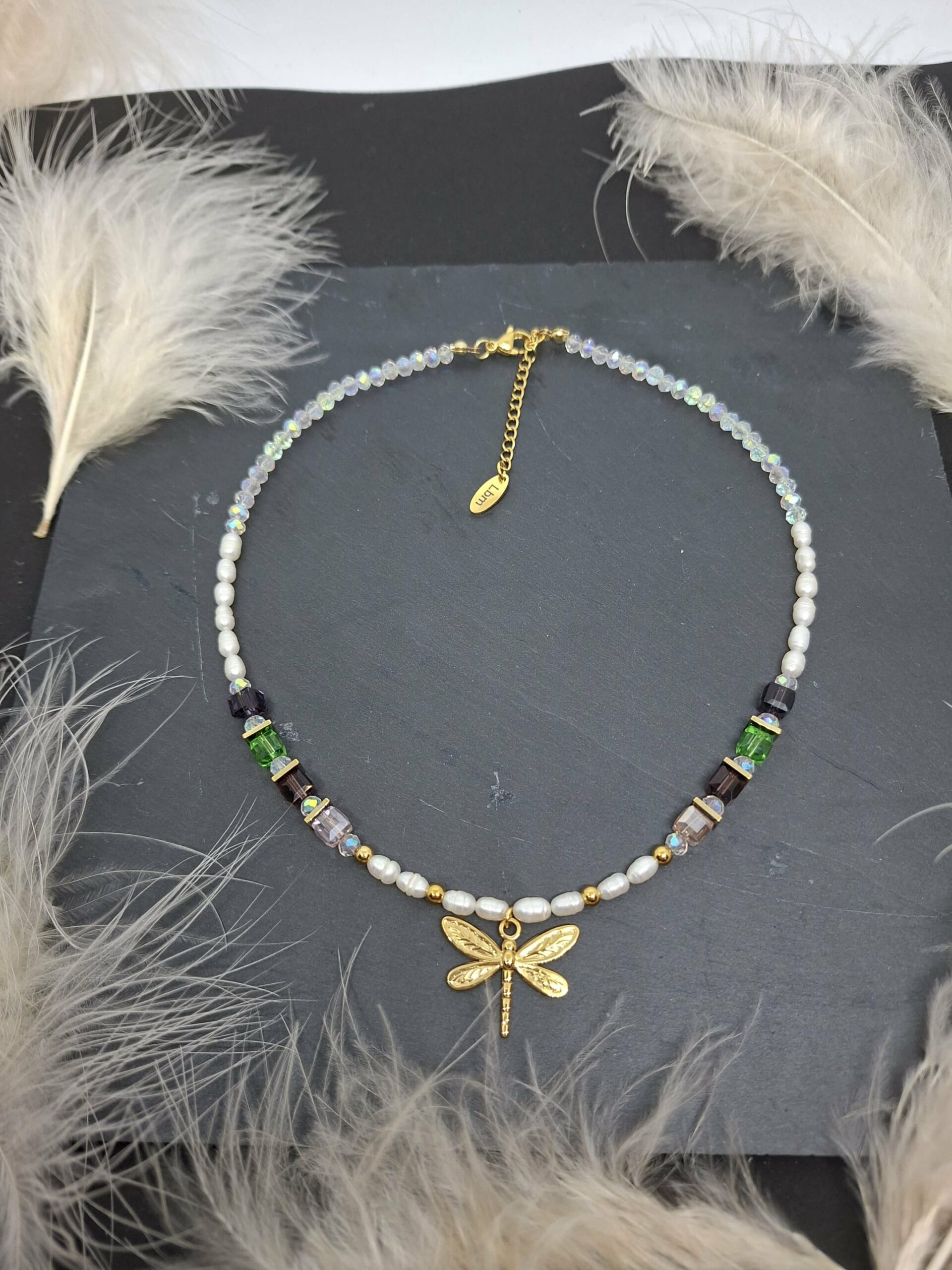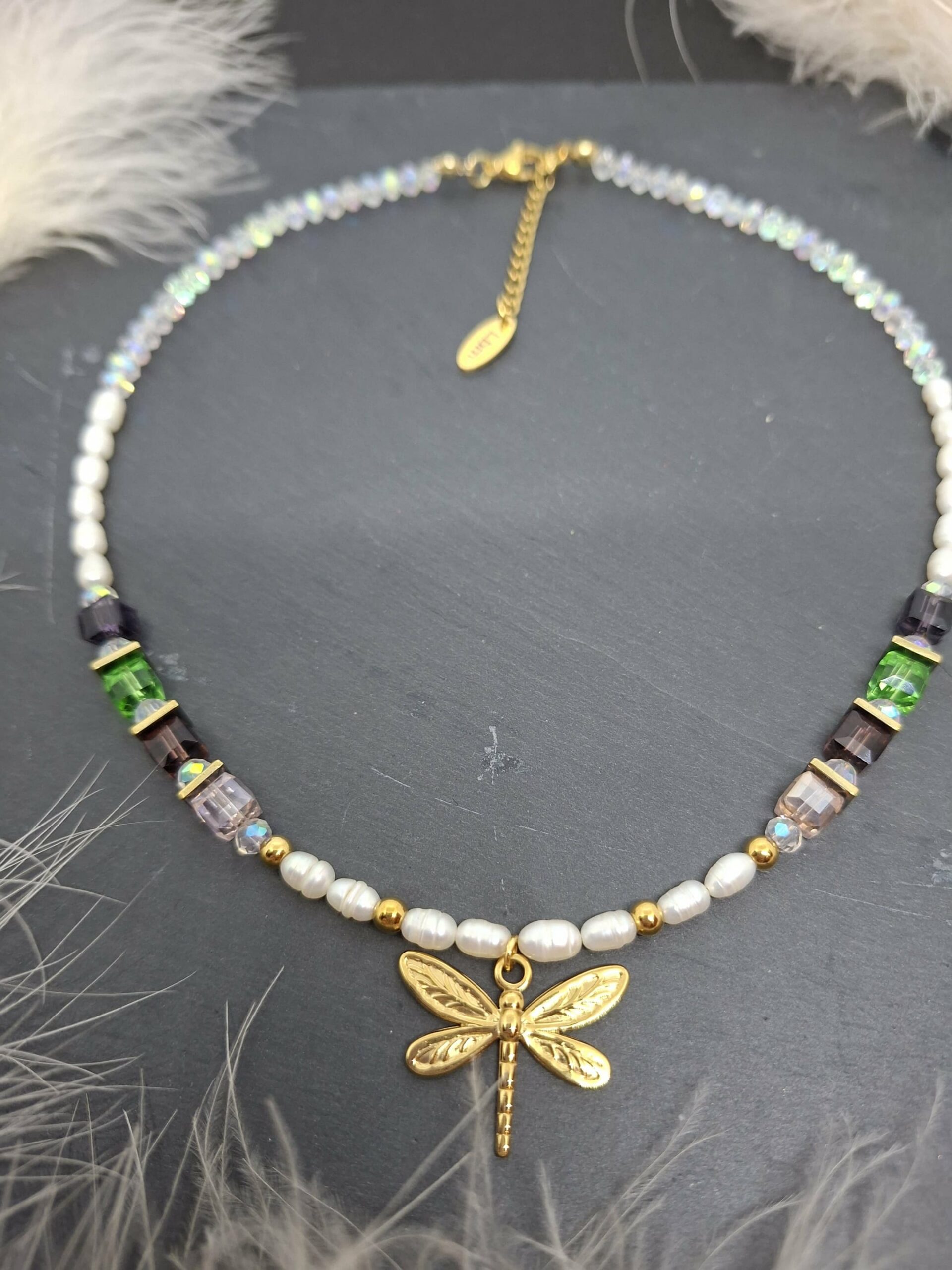 Collier composé de perles facettées en cristal, perles cube en cristal et perles d’eau douce, perles intercalaires en hématite dorée. Pendentif libellule en acier inoxydable.