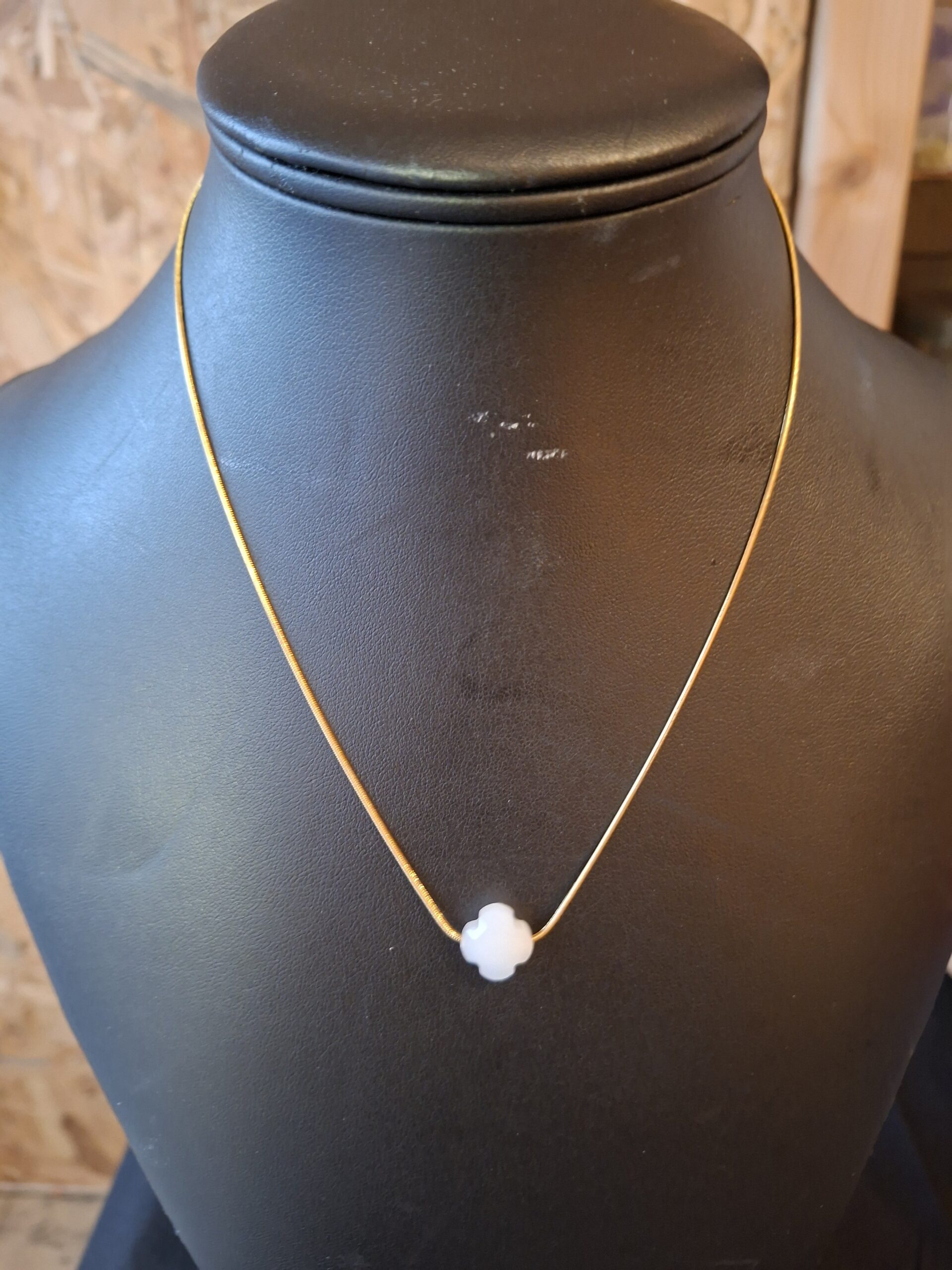 Ce collier se compose d’une chaîne serpentine fine en acier inoxydable doré, élégante, fluide et agréable à porter. En son centre, une perle trèfle en verre facetté attire subtilement la lumière et ajoute une touche de douceur et de raffinement.