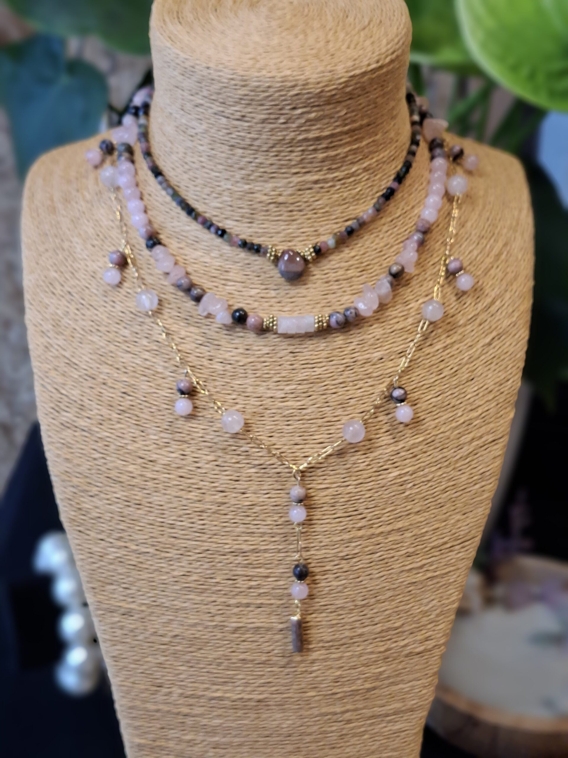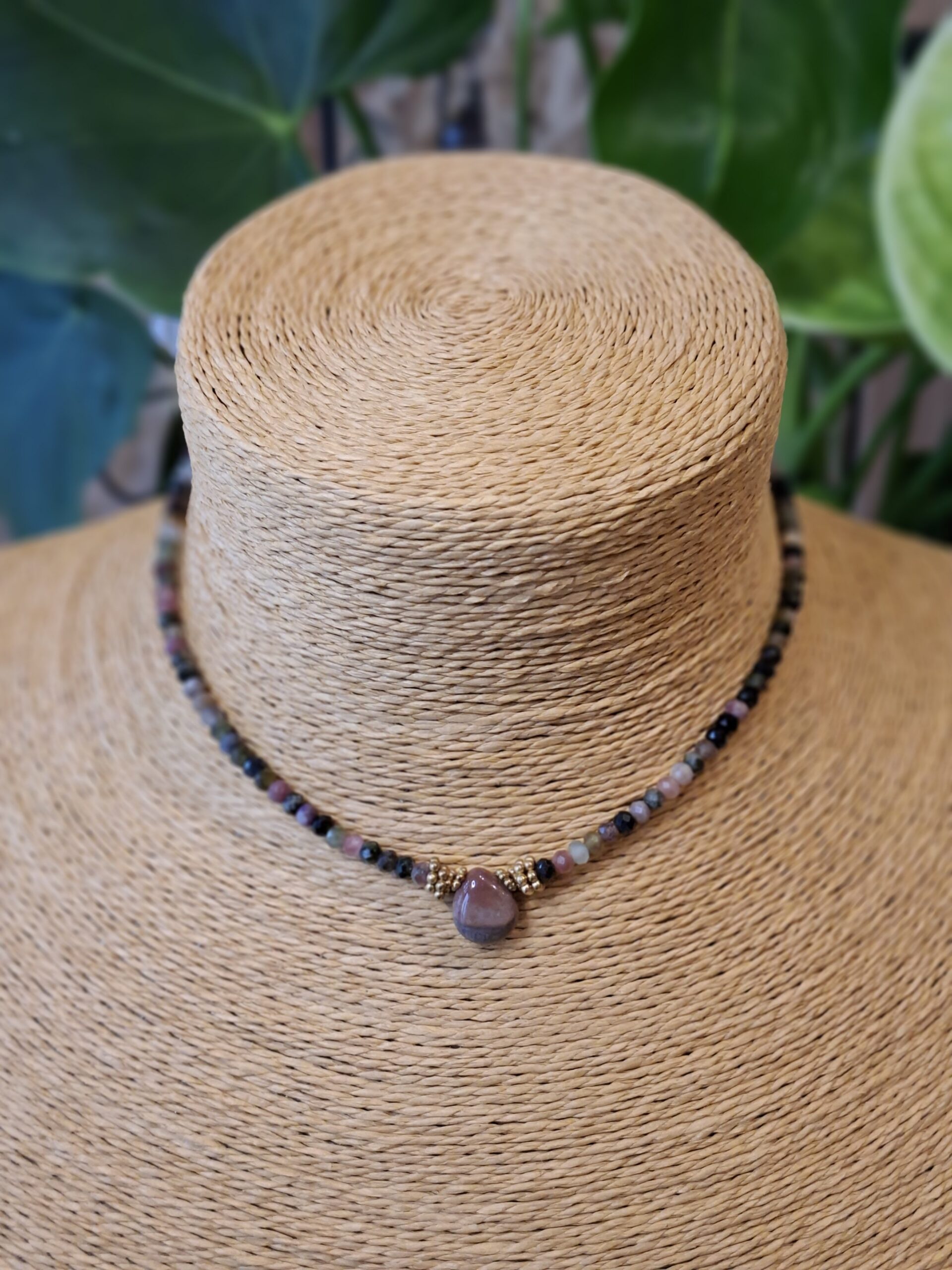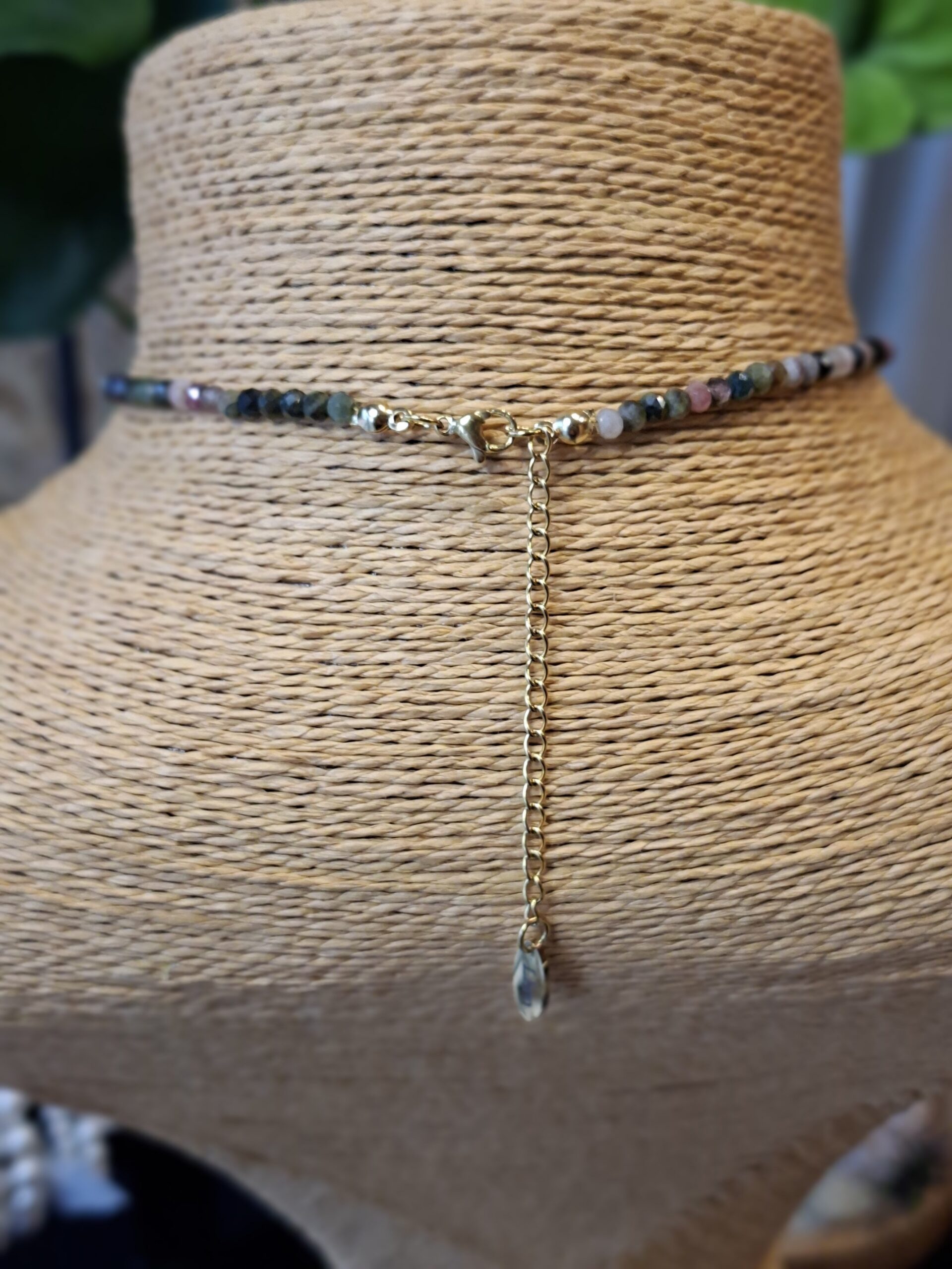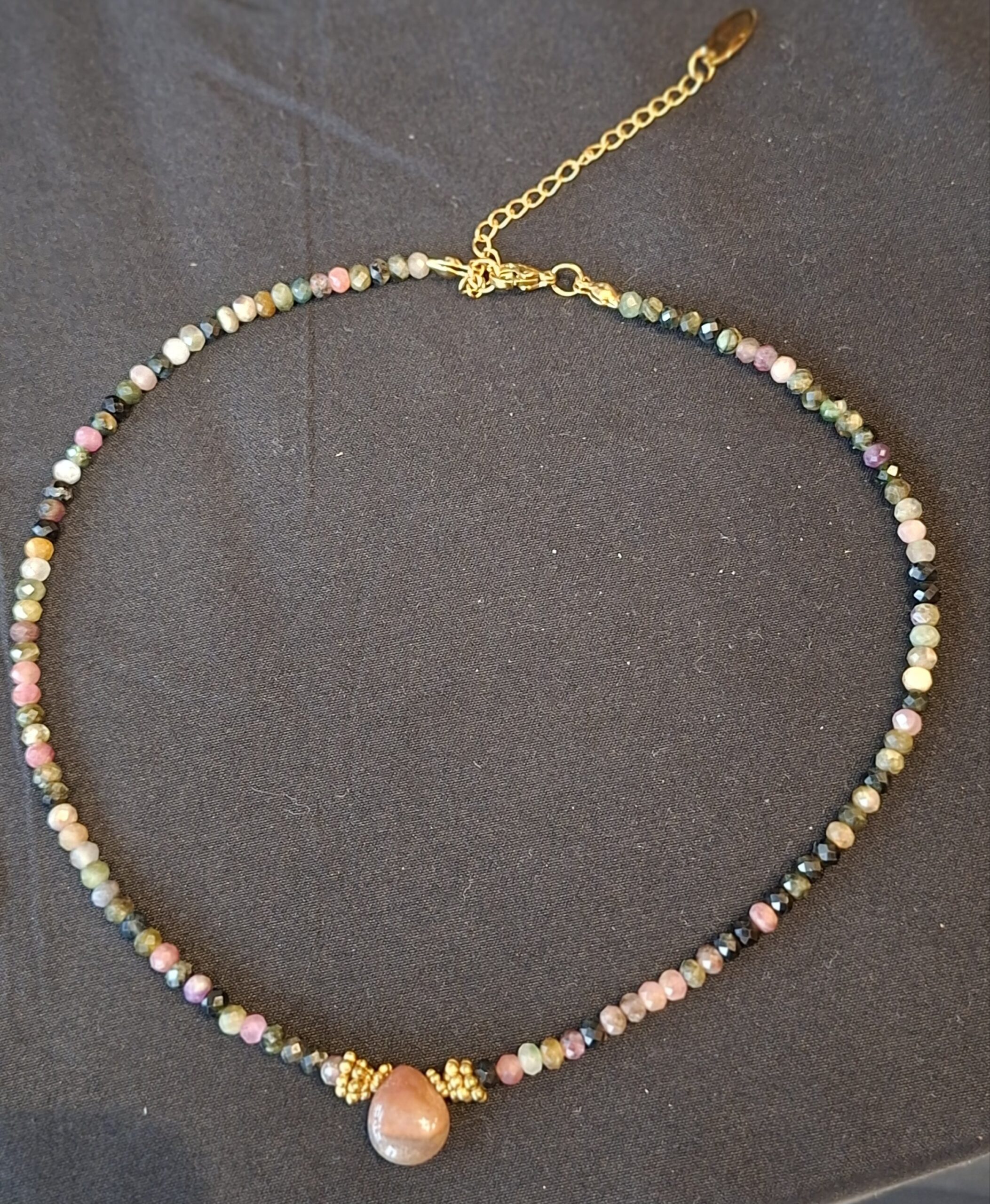 Collier fin composé de perles de tourmaline facettées aux nuances naturelles de vert, rose et brun, sublimé par une goutte d’agate indienne en pièce centrale.