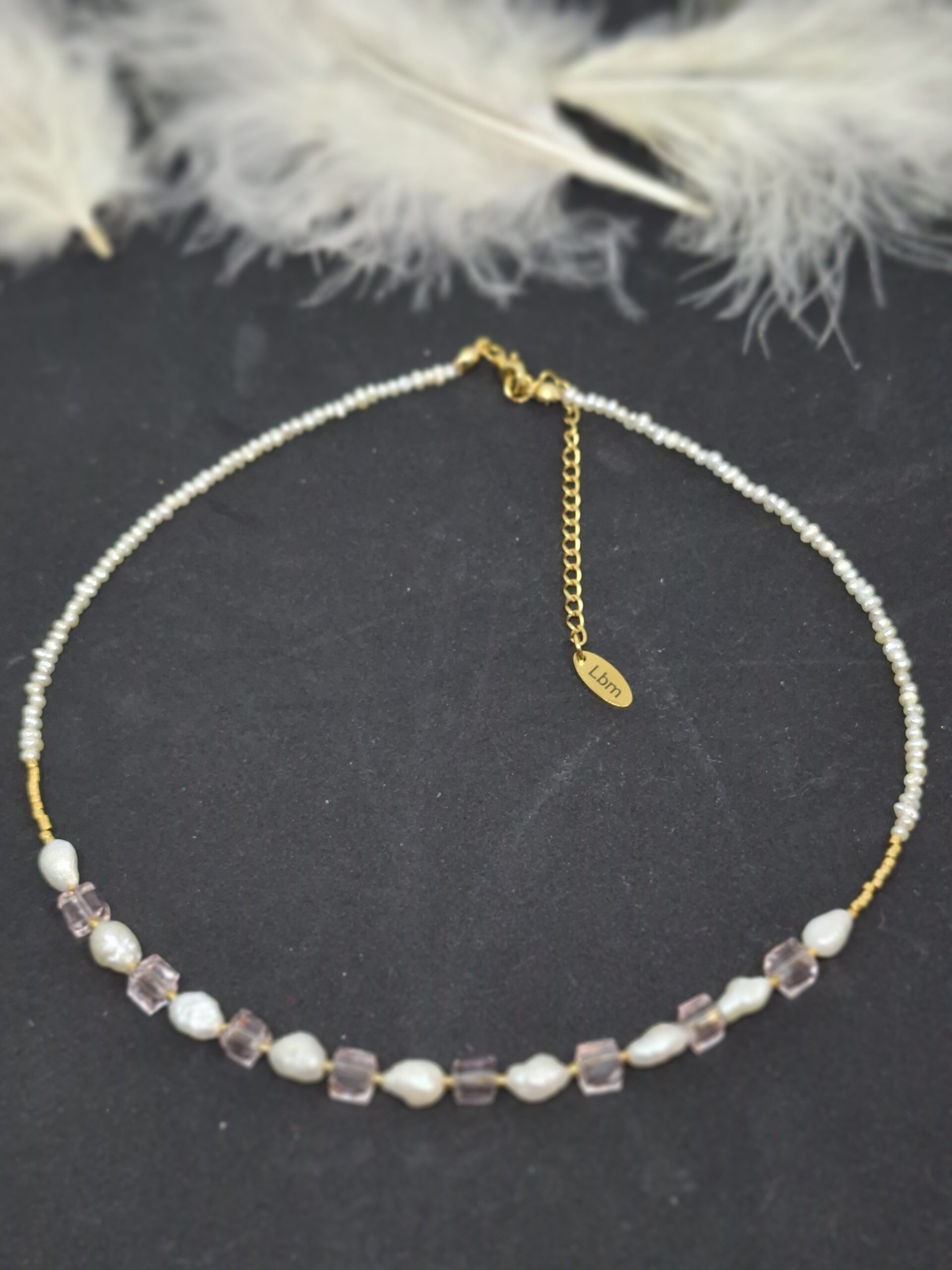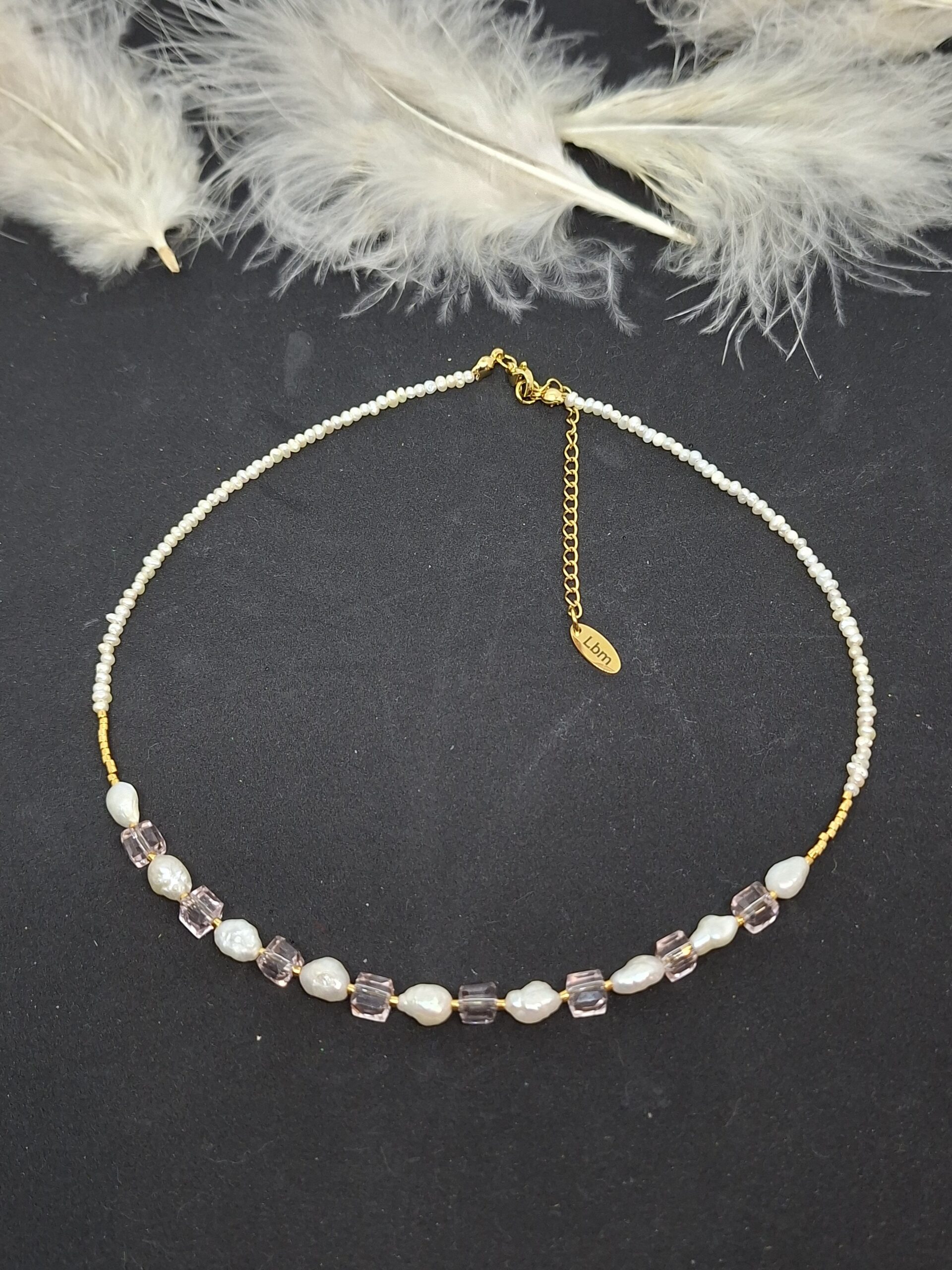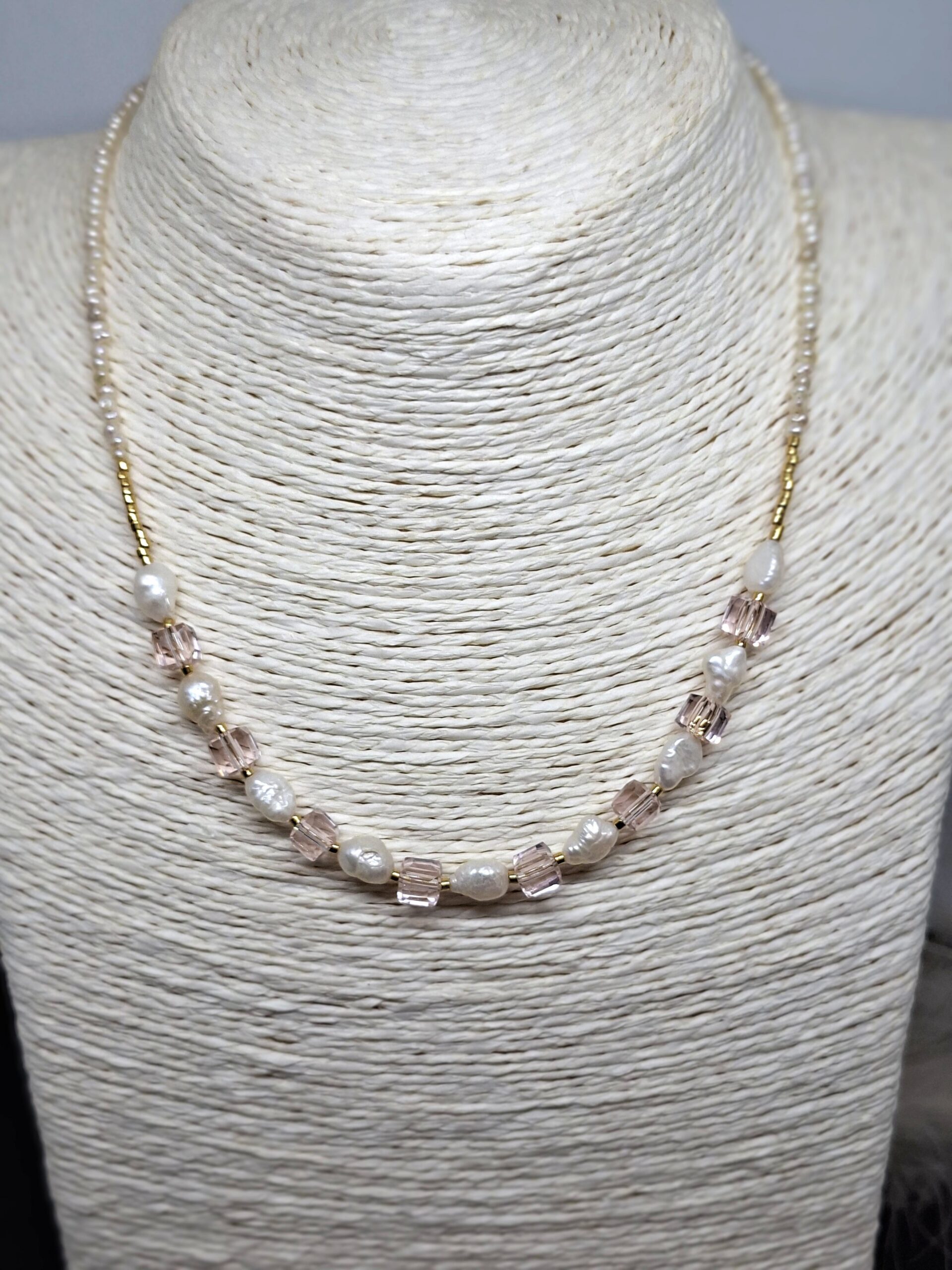 Collier unissant perles de culture d’eau douce de calibres différents, miyuki, et cubes en cristal rose.