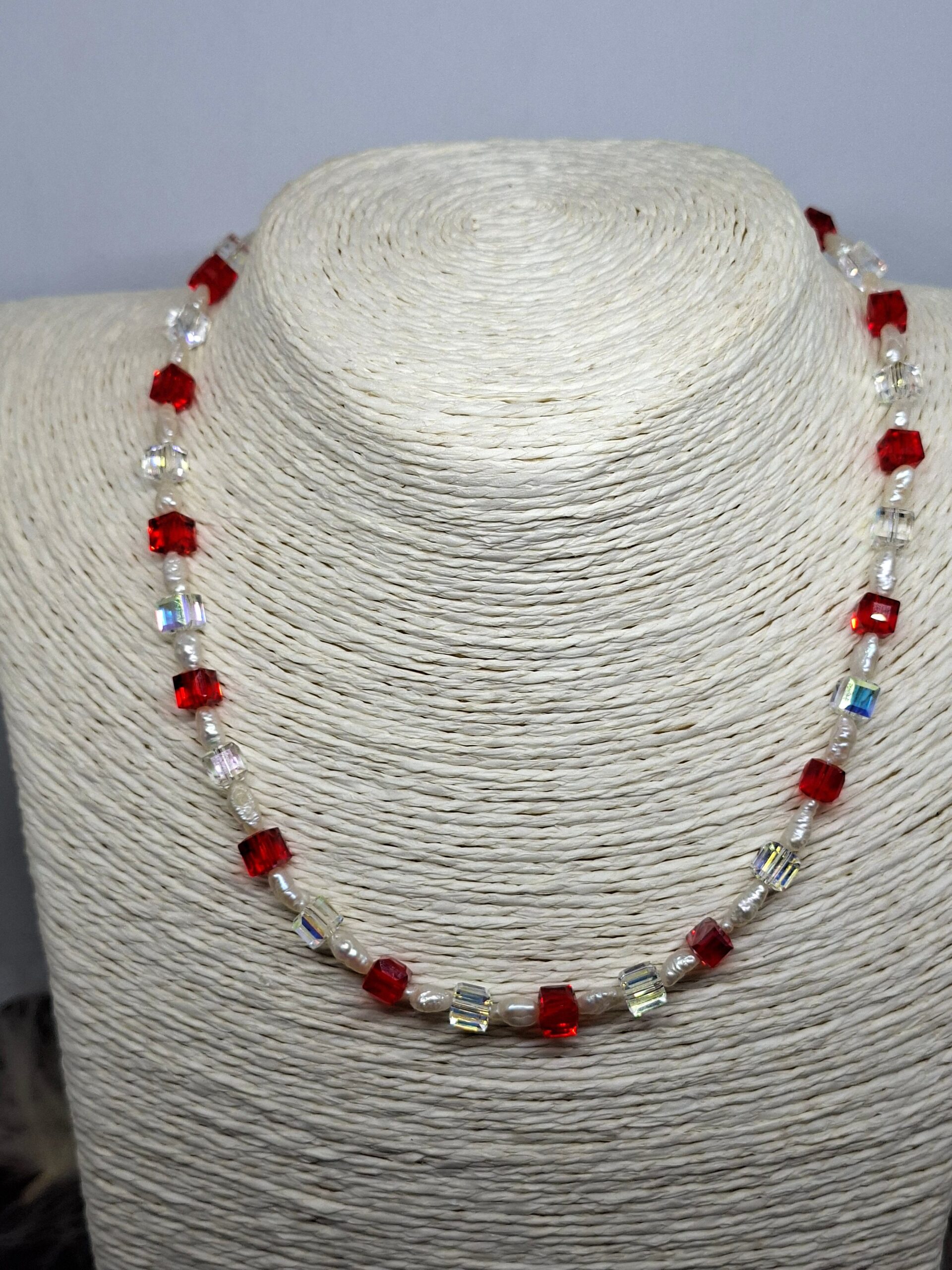 Collier unissant perles de culture d’eau douce baroques et cubes en rouge et transparent. .