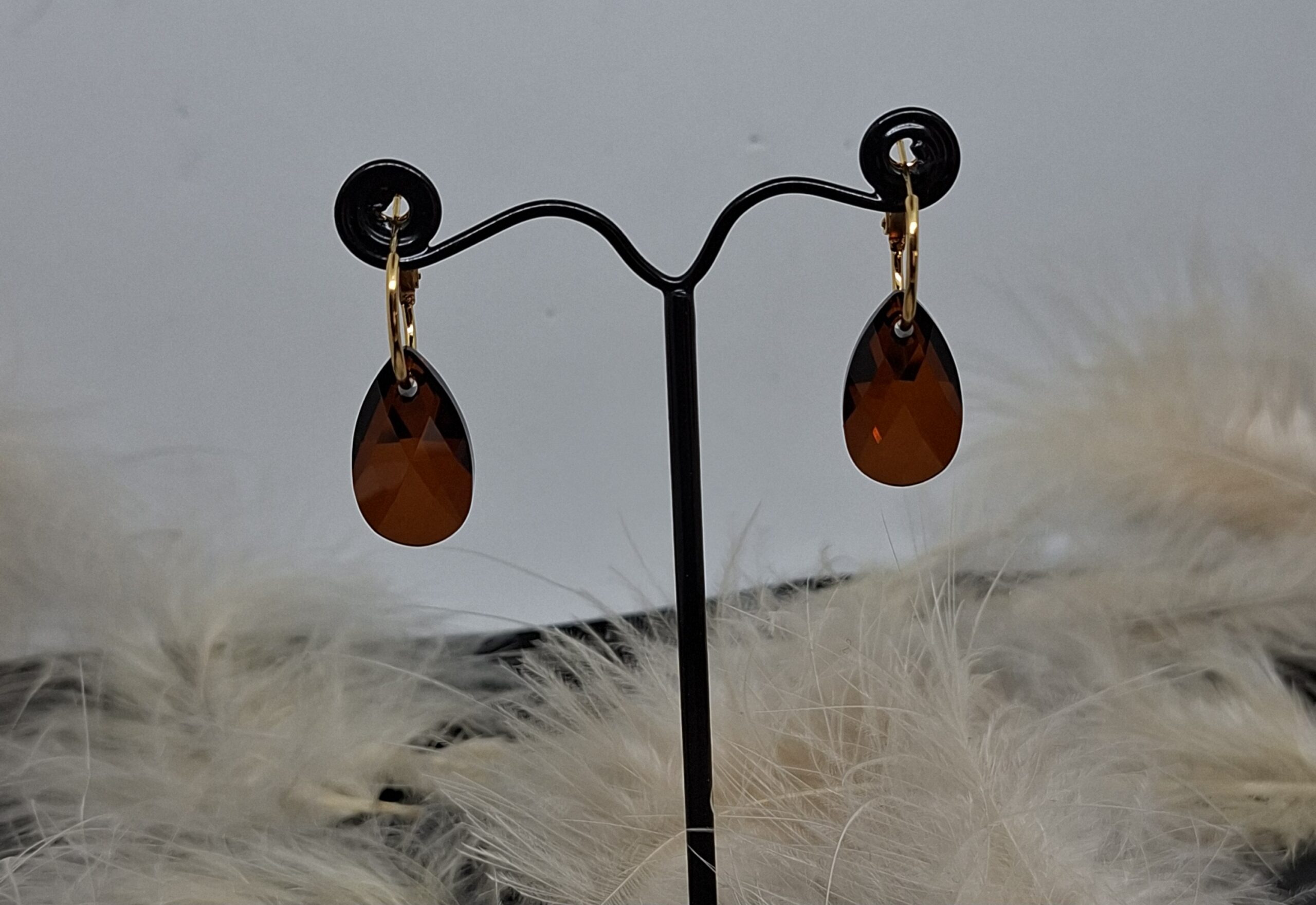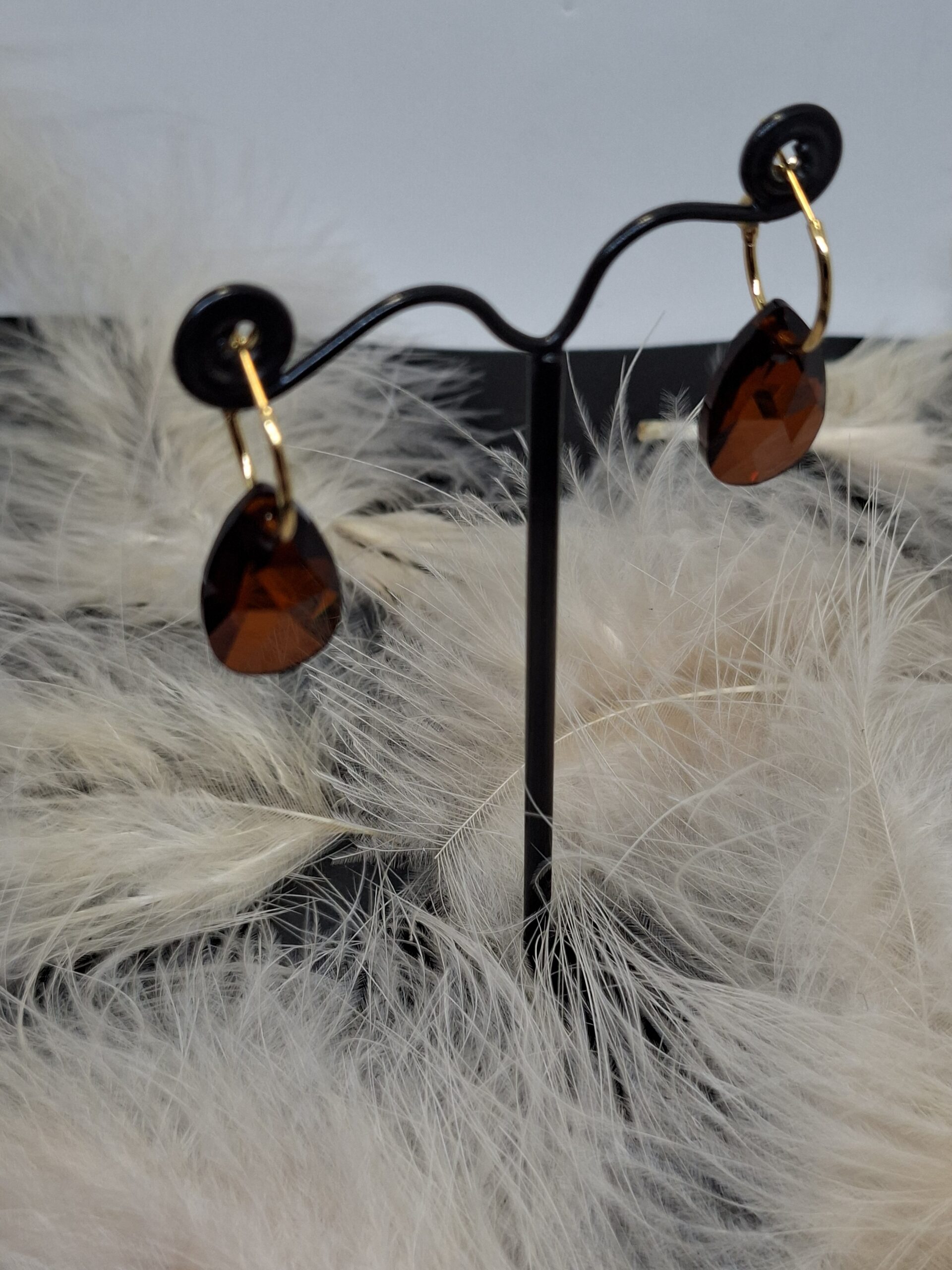Une Goutte de cristal Swarovski Smoked Amber Doré sur une petite créole dorée.